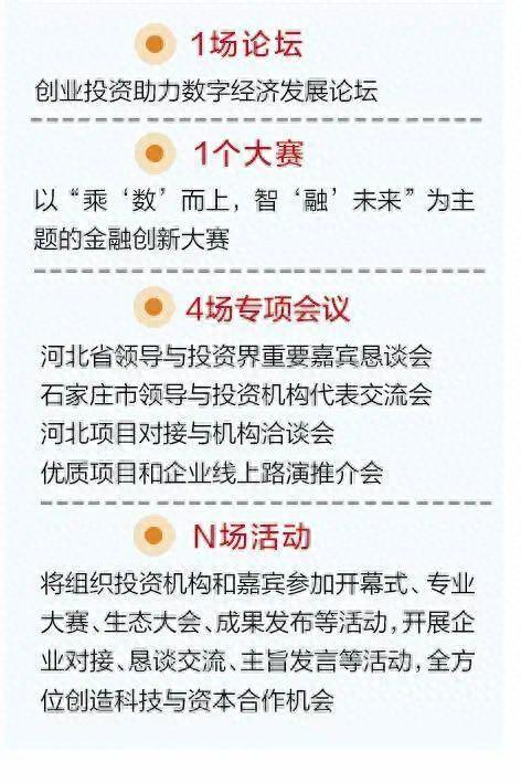 1场论坛即创业投资助力数字经济发展论坛。论坛以“打造科创资本强劲引擎、助力数字经济加快发展”为主题,邀请知名投资基金等机构主要负责人进行现场演讲、圆桌对话,开展博览会获奖和优质项目路演发布,宣介河北投资基金,促成项目签约,同时做好会后跟踪等活动。