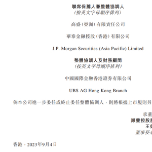 此前,顺丰控股于8月21日向港交所提交上市申请, 高盛 (亚洲)有限责任公司、华泰金融控股(香港)有限公司及J.P. Morgan Securities (Asia Pacific)Limited为其联席保荐人兼整体协调人。