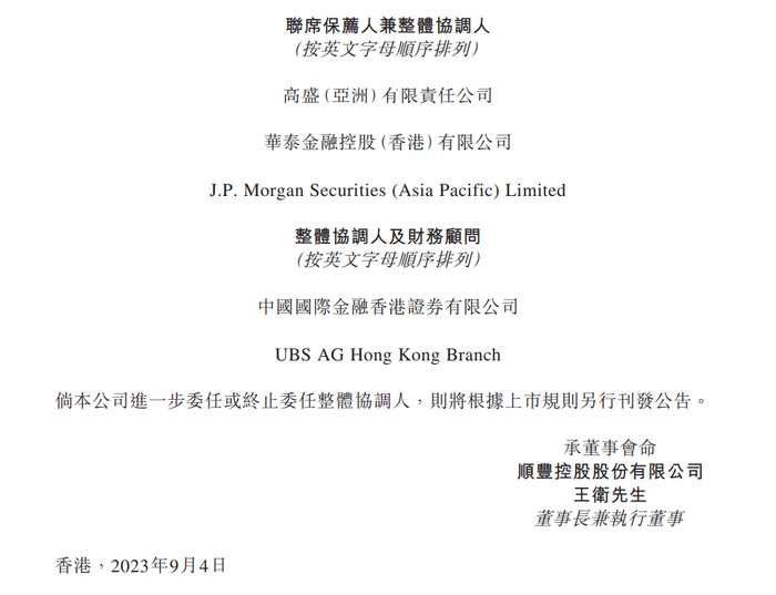 9月4日, 顺丰控股 在港交所披露整体协调人公告-委任(经修订),公司于9月3日进一步委任中国国际金融香港证券有限公司及UBS AG Hong Kong Branch为整体协调人及财务顾问。