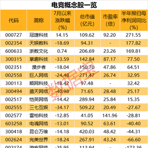 证券时报·数据宝统计,A股中电竞概念股除相关游戏个股外,还包括电竞设备、电竞酒店、电竞赛事相关的个股。业绩上来看,15只电竞概念股中,9只上半年业绩实现增长,其中冠捷科技、天娱数科、浙数文化上半年归母净利润同比增幅居前,均在100%以上。