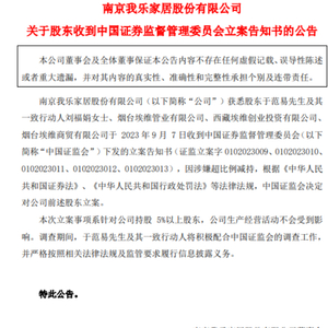 9月7日午间,我乐家居公告,公司获悉股东于范易及其一致行动人刘福娟、烟台埃维管业有限公司、西藏埃维创业投资有限公司、烟台埃维商贸有限公司于2023年9月7日收到中国证监会下发的立案告知书,因涉嫌超比例减持,根据法律法规,中国证监会决定对公司前述股东立案。