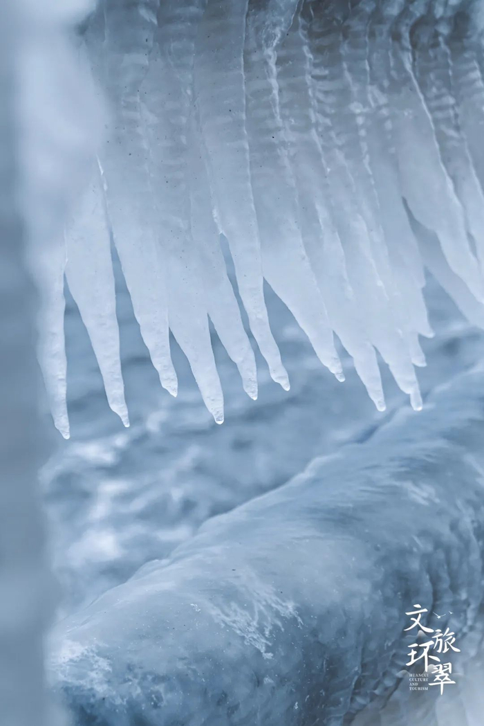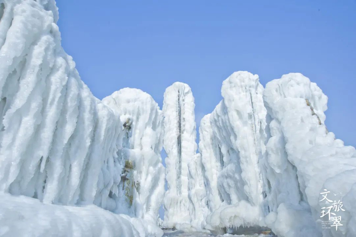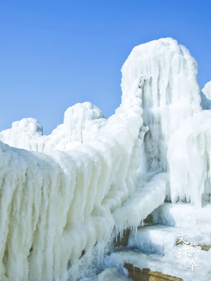 冰凌错落叠加,远观如厚重的雕塑,近赏却似飞鸟的羽翼,千姿百态,在这冰冻的时间里,藏着大海的眷恋。