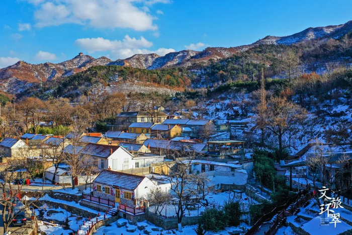 雪后的村庄错落有致,山林之色被笼罩在皑皑白雪中,黑白相间,浓淡相宜,更添古朴淡素之色。