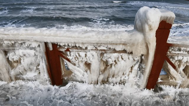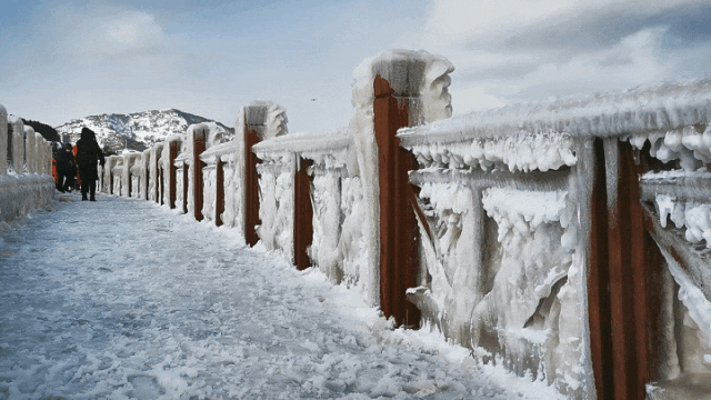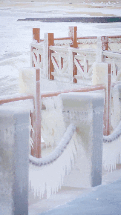 不论是通往大海的石阶,还是海边的木质栈道,几乎都被冰层“封印”,冰凌晶莹的白与大海冷峻的蓝搭配在一起,成为冬季海边限定版风景。