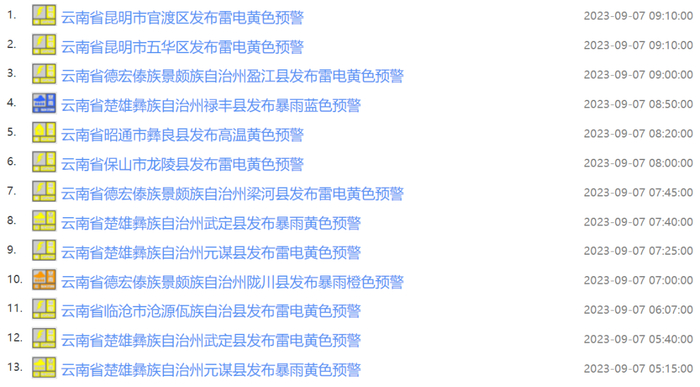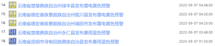 昆明市气象台2023年09月07日02时30分发布雷电Ⅳ级预警:预计未来12小时,西山、五华、盘龙、官渡、富民、嵩明、禄劝、东川、寻甸将出现雷电活动,出现雷击灾害事故的可能性较大,并伴有平均风力7级或阵风9级以上大风、局地大冰雹、短时强降水等强对流天气,相关部门做好防雷电、防大风、防冰雹工作,公众在强对流过境期间暂停户外活动。