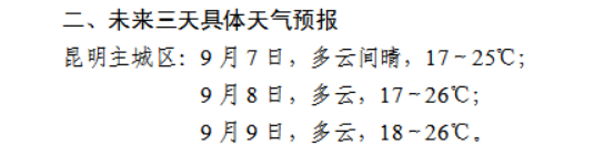 9月6日20时到9月7日20时:保山市、德宏州、临沧市、普洱市、西双版纳州、红河州西南部阴有小到中雨局部大雨,昭通市南部、曲靖市、昆明市、楚雄州东部晴间多云,其他地区多云有分散性阵雨。
