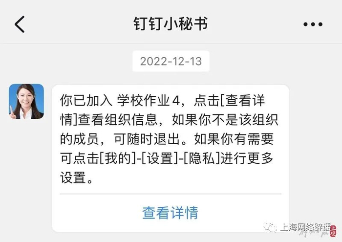 所以,从记者亲历和调查看,家长和学生要注意,收到钉钉小秘书推送的学习信息、学习组群等,不能全信;如果在这些群聊中发现有涉及活动举办、费用收取等信息,更要与真老师确认,当心上当受骗。还有,用户要注意隐私保护,减少被陌生人或组织“拉群”的可能。