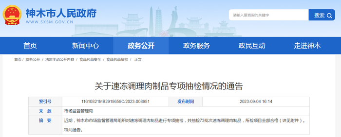 中国质量新闻网讯 近日,陕西省神木市人民政府网站发布关于速冻调理肉制品专项抽检情况的通告。