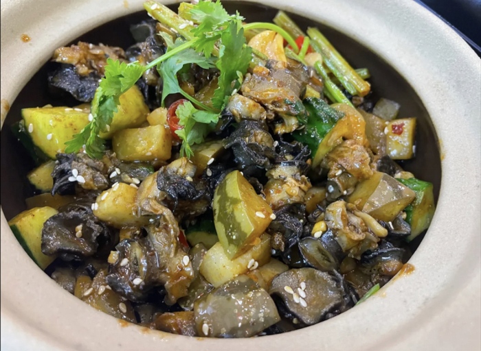 还有一些海南口味的小菜。酸瓜仔炒田螺是每去必点,海南的酸瓜仔酸香爽脆,加了小米辣、黄瓜跟田螺一起炒制,味道很不错,田螺口感软脆还带着一点点韧劲,下酒下饭都很适合。