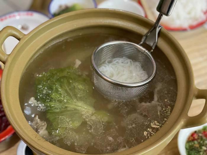 在吃的差不多的时候,就该轮到一个不可或缺的环节——烫粉。用桌桌都有的漏勺把手工米粉稍微烫煮,盛到碗里,再打上自己喜欢的肉类和内脏,撒上葱花,一碗自己烫煮的猪肉猪杂粉就好了,可以加些酸菜,酸香脆爽,又是另外一番滋味。