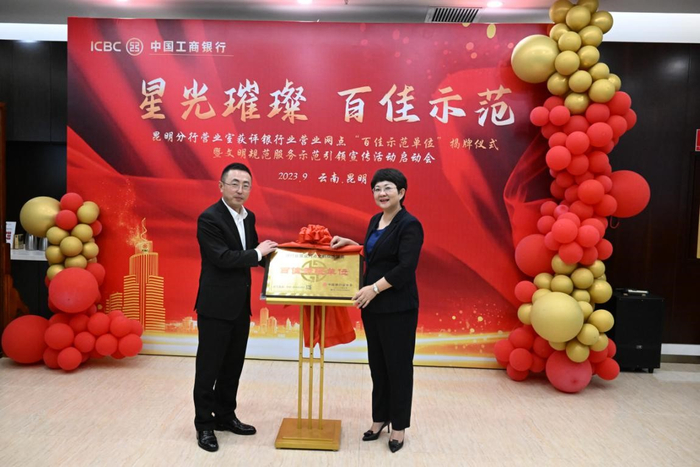 工商银行云南分行王玲副行长、陈晓副行长为昆明分行营业室“百佳示范单位”揭牌