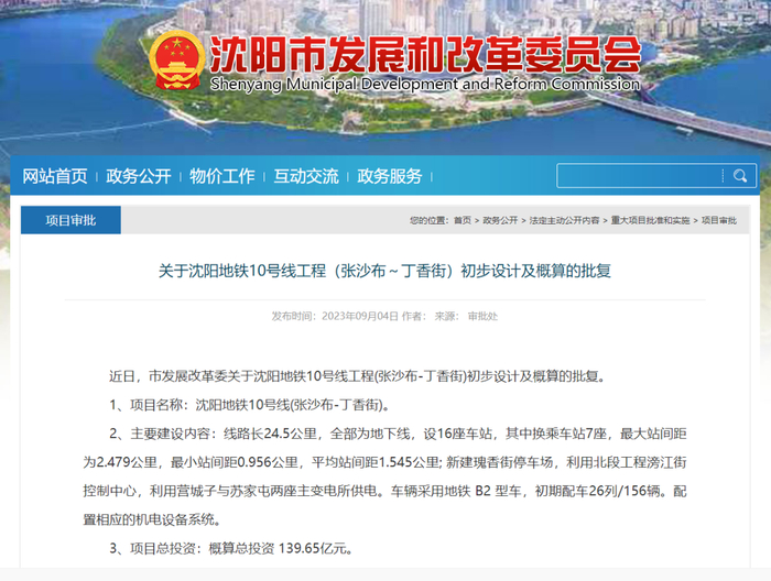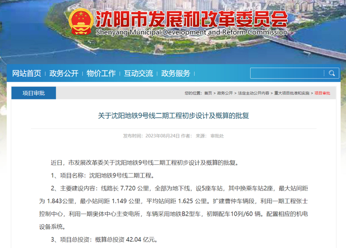 近日,市发展改革委关于沈阳地铁9号线二期工程初步设计及概算的批复。