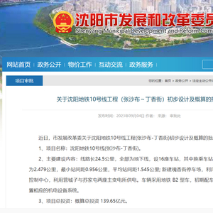 近日,市发展改革委关于沈阳地铁10号线工程(张沙布-丁香街)初步设计及概算的批复。