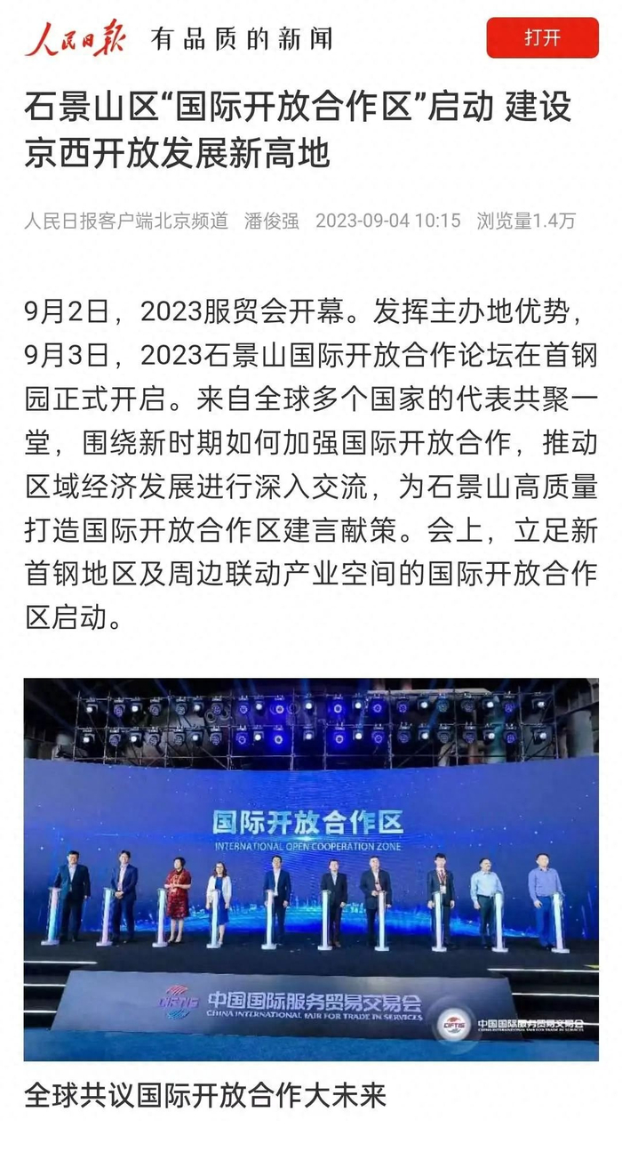 在石景山国际开放合作论坛发布亮相的“国际开放合作区”是石景山区坚持开放合作、落实北京市委、市政府重要部署、充分发挥服贸会带动和溢出效应的重要举措,也是推动京西地区产业转型发展的重要支撑。