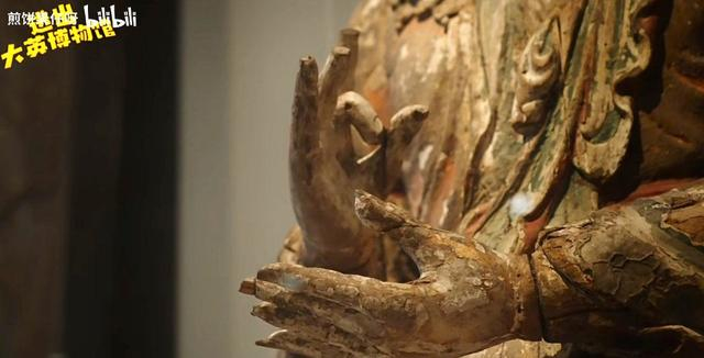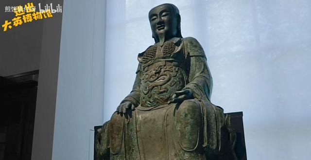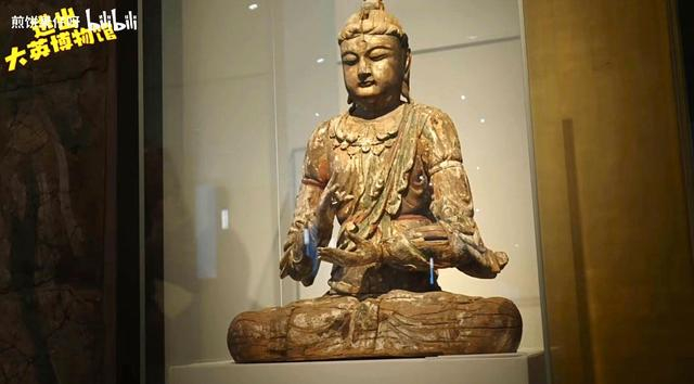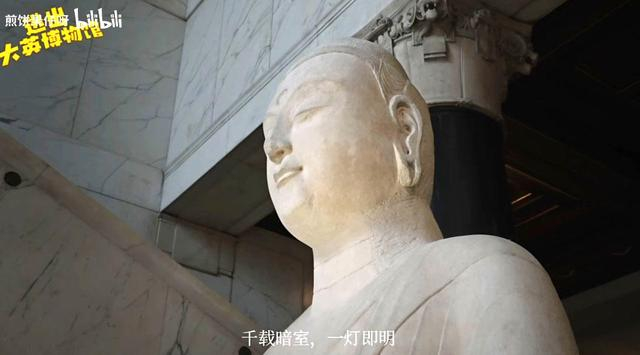 虽然《逃出大英博物馆》中将这尊雕塑称为弥勒佛,但从其右手所执的绿色布袋可知,这其实是一尊布袋和尚的雕像。布袋和尚虽然是弥勒佛的化身,但两者毕竟不同。