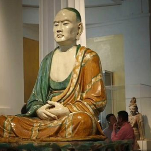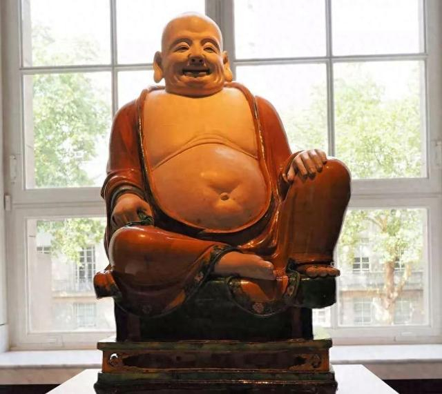 佛教中有纵、横三世佛之分,弥勒佛是纵三世佛中的未来佛,俗称笑佛。布袋和尚则是五代后梁时期的僧人“契此”,因常背负一只布袋开口而笑,因此又相传是弥勒佛转世。明太祖朱元璋以弥勒出世为由起事,因此明代为防有人造反,一度禁止弥勒崇拜,貌似弥勒佛的雕塑多为布袋和尚。大英博物馆的这尊布袋和尚雕塑为三彩陶塑坐像,笑容温暖,亲切慈祥,硕大的肚子裸露无釉彩,有大肚能容天下事的气概。