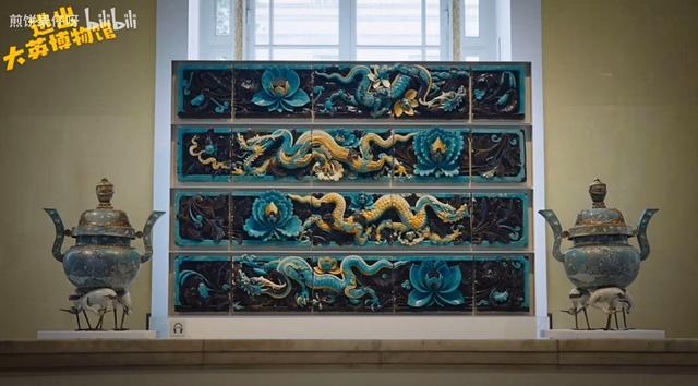 进入存放中国文物的33号展厅,迎面就是这一组由二十块珐华彩釉面高浮雕明代陶砖构成的陈列品。这套龙纹砖宽2.44米,每排高39厘米,厚12.7厘米,装饰带上四条充满活力的蓝黄釉山爪龙在莲花与牡丹之间穿行嬉戏,第二条还追逐着一颗燃烧着的珍珠,精致细腻,栩栩如生。