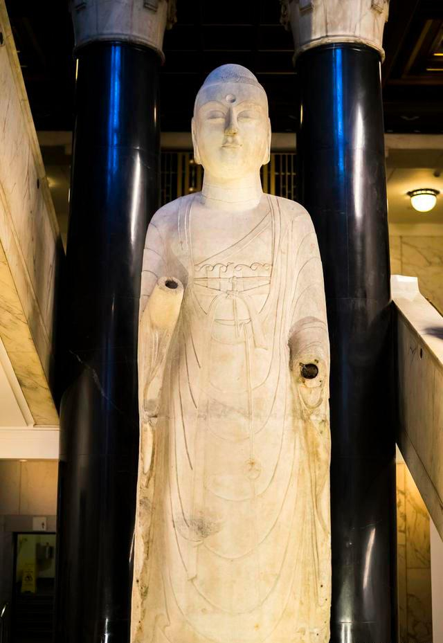 矗立在大英博物馆楼梯空隙之间的这一尊白色阿弥陀佛像,堪称整座博物馆中最大最雄伟的佛像。佛像整体由大理石雕刻,高5.8米,重约2吨。佛像面容俊秀,双目微启,双唇紧闭,微露一丝浅笑,披通肩式袈裟,长裙束腰与胸前系结,由于采用浅浮雕手法,通身袈裟折纹更显简练。佛像的双手虽已丢失,但其右手臂上抬,左臂平出略向下,仍可判断出佛手姿势应为右手施无畏印,左手施与愿印。