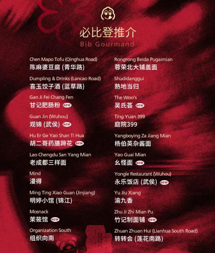 必比登推介餐厅增至20家,其中8家餐厅首次进入必比登推介榜单,既有甘记肥肠粉、幺怪面这样的粉面小馆子,又有永乐饭店(武侯)、胡二哥药膳蹄花这样的成都平价特色菜馆。不少老成都表示:米其林也有接地气的一面!