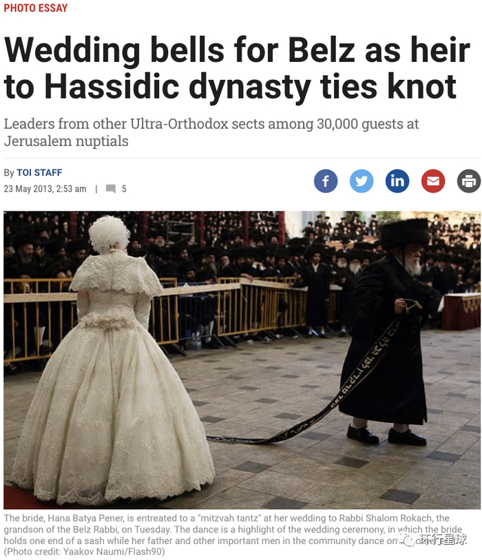 2013年耶路撒冷举办的犹太人婚礼。新郎是十八岁的Shalom Rokeach ,是哈西德派Belz王国领袖之孙,他迎娶十九岁新娘Hannah Batya Penet。图:timesofisrael