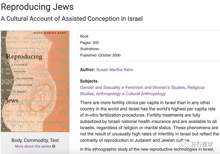 犹太人的生殖观念也比较开放,崇尚科学。在著作《再生产犹太人:以色列辅助受孕的文化诠释》中,哈佛大学人类学家苏珊•卡恩(Susan Martha Kahn)认为,人工授精、卵子捐赠、体外受精、代孕等生殖技术在以色列非常发达,广为国民接受,是因为生殖科学与犹太律法的血缘和家族价值观一致。