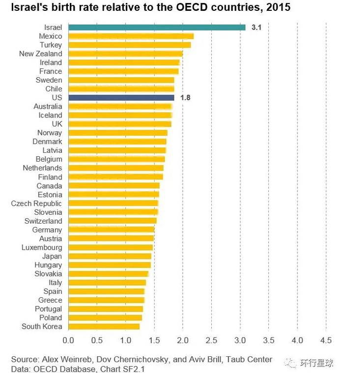 首先,以色列人口出生率是发达国家最高的。2020年平均每位以色列女性生育2.9个孩子,而英国和法国分别是1.6和1.8。以色列生育率是经济合作与发展组织(发达国家阵营)中最高的。