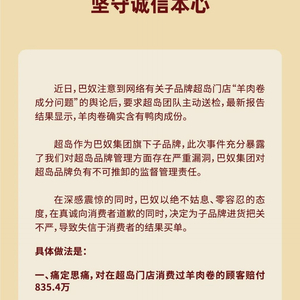 巴奴称,对超岛合生汇店、丰科万达广场店、龙德广场店、石景山万达店即日起全部停业整改、全面彻查。巴奴将对在超岛门店消费过羊肉卷的顾客赔付835.4万元,赔付范围自2023年1月15日超岛合生汇店开业起销售的13451份羊肉,涉及共8354桌。明日起,凡消费过该产品的顾客,可凭支付记录,在10:30-22:00期间,到超岛合生汇店领取赔偿现金1000元。
