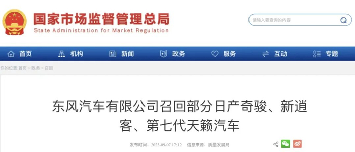 日前,东风汽车有限公司根据《缺陷汽车产品召回管理条例》、《缺陷汽车产品召回管理条例实施办法》和《机动车排放召回管理规定》的要求,向国家市场监督管理总局备案了召回计划,自2023年12月30日起,召回2018年7月23日至2021年9月26日生产的部分东风日产品牌奇骏、新逍客、第七代天籁汽车,共计1,188,020辆。