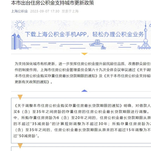 9月7日,上海公积金管理委员会宣布调整公积金购买存量住房最长贷款期限,自10月7日起施行。根据新政,上海二手房公积金贷款期限最长可达30年,在业内人士看来,这意味着在新一轮购房政策宽松期中,上海公积金政策继续发力,且超出了传统的额度增加等范畴。