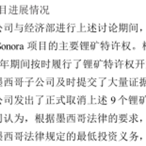 然而,墨西哥矿业总局(DGM)仍然发起了对墨西哥子公司持有的9个锂矿特许权的复核,其中包括Sonora项目的主要锂矿特许权。根据DGM的说法,若墨西哥子公司未在规定时限内提交充分证据以证明在2017年至2021年期间按时履行了锂矿特许权开发的最低投资义务,将面临取消上述锂矿特许权的风险。