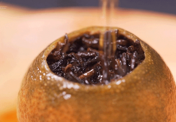 滚烫的开水冲泡在整颗小青柑上,便能一下子激发了小青柑的魔力。