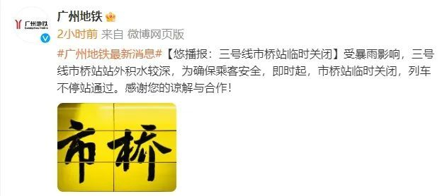 据@广州地铁,受暴雨影响,三号线市桥站站外积水较深,为确保乘客安全,即时起,市桥站临时关闭,列车不停站通过。