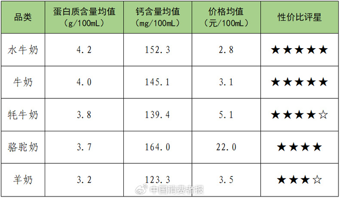 本次比较试验从线上线下共计购买了32款小众奶,包括6款水牛奶、7款牦牛奶、6款骆驼奶、6款羊奶和7款牛奶(牛奶多为中高端产品),产品类型均为灭菌乳,每100mL的价格在1.5元至25.4元不等。试验依据相关国家标准对样品的蛋白质、钙、脂肪、糖、碳水化合物等营养物质进行了检测,并对不同乳源样品进行分类比较。