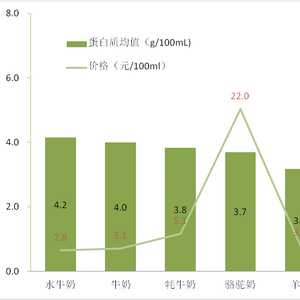 👉 水牛奶和牛奶的蛋白质含量较高,均值分别为4.2g/100mL和4.0g/100mL;