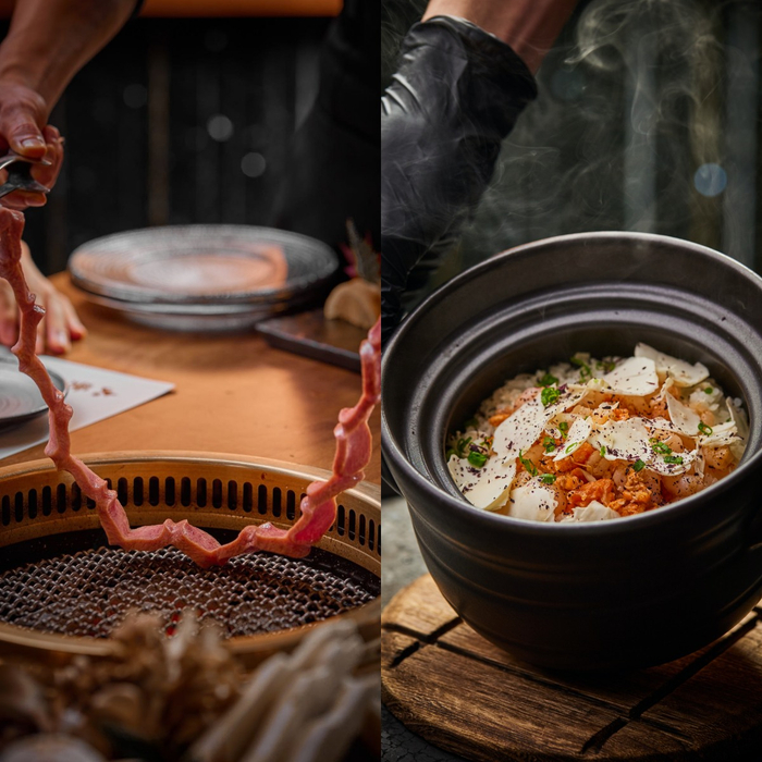 今年八月,大无烧肉迎来开业两周年。在两周年庆媒体品鉴宴上,大无烧肉推出多道新菜品。前菜中的【番茄啫喱渍槐花】是用丹东的铁皮番茄挖空去瓤,底下放用铁皮番茄汁渍过12小时的槐花及富山白虾,铁皮番茄果味更浓郁,果肉更肥厚,甜度也更高。【草芽配干式熟成风干牛舌脆片】选用经过45天干式熟成的牛舌,肉质致密,有明显奶香味,云南的草芽经新鲜空运,切片后与京水菜搭配上大无特调的酸甜口沙拉汁。冰鲜肉中,【冰鲜牛舌牛排】取牛舌最尾端最精华的部位,一整块烤到金黄色后切拇指宽的厚切,再烤至5-6分或者7-8分熟。口感香脆丰腴,奶香十足且非常细嫩,可以吃到牛舌本身的香气和味道。【冰鲜牛三筋】即上肩胛肉,也称为牡蛎肉和板腱肉。口感较扎实,夹在肉里面的筋纹很有嚼劲,同时有充足的奶香和肉香。烧肉部分中,【爆珠和牛眼肉芯】是烤肉五大王牌之一。媲美澳洲M12级别的眼肉芯的精华部位刷上主厨秘制的寿喜酱,烤五六分熟后包裹着澳洲指橙,入口奶香浓郁,柔嫩多汁。海鲜中的【台海手钓鱿鱼】搭配日本进口芥末盐,口感Q弹鲜甜,炭香诱人。