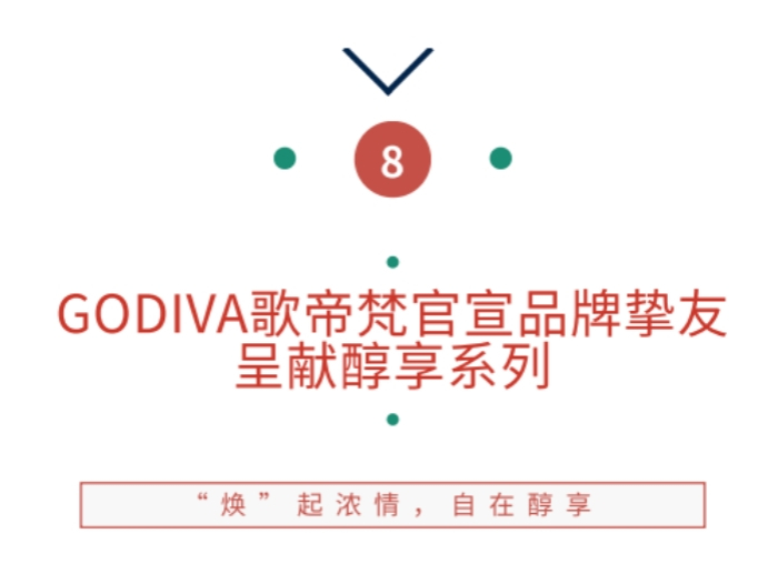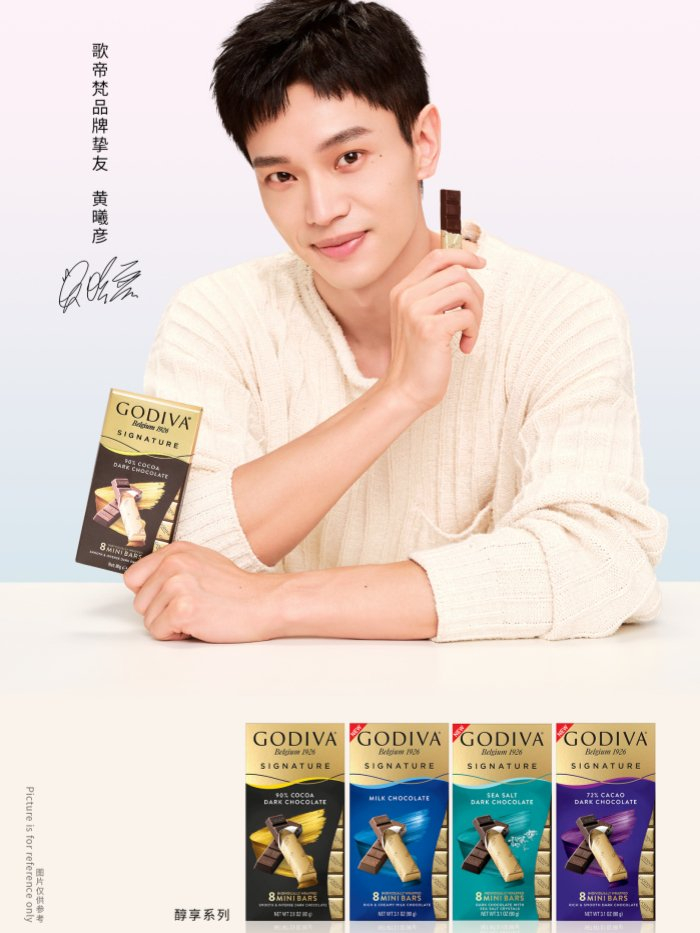 2023年8月30日,GODIVA歌帝梵正式官宣青年演员黄曦彦为品牌挚友,并呈现醇享系列。GODIVA歌帝梵醇享系列采用独立包装,精致小份开启取食便捷,且本系列包含多种口味:90%可可黑巧克力制品,浓郁入口,微苦回甘;72%可可黑巧克力制品,微涩甘醇;海盐黑巧克力制品,微咸浓郁;扁桃仁黑巧克力制品,烘焙甘醇;牛奶巧克力,双倍香浓...多种香醇滋味,令人开启舒适状态。