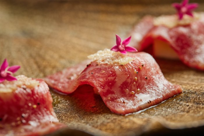 料理中的【干式熟成牛肉南瓜花天妇罗】选用M9+的臀腰肉盖,经过60天以上的干式熟成,切成小粒搭配芒果酱,塞入南瓜花内,炸成天妇罗。主食部分,【花椒芽干式熟成牛舌釜饭】是米饭盖上一层干式熟成45天的牛舌薄片,风干后的新鲜花椒芽研磨细碎,跟紫苏盐拌匀,撒一层在牛舌表面,点缀上几支鲜花椒芽装饰。【象拔蚌秦椒炒新化粉】采用福建莆田的兴化细米粉,象拔蚌切丝搭配自制秦椒酱爆炒韭黄,撒上一层虾籽跟熟成风干后的牛肉丝。甜品中的【时令水果泡沫】将新鲜的荔枝去核去皮,榨汁澄清后做成绵密的泡沫,时令的水果冷冻成冰沙的口感,切小粒放于碗底。