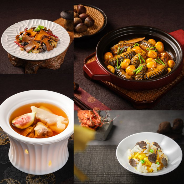 【无花果老母鸡炖花胶汤】选用清润新鲜的无花果搭配滋补温润的老母鸡和花胶,用粤式一炉火慢炖六小时,是理想的秋日进补汤品。而【秋板栗烧马鞍桥】中同样作为秋季时令的特色食材,板栗为鳝鱼带来更为柔美清甜的滋味。【爆炒什菌】中主厨选用牛肝菌、鸡枞菇、口蘑等多种风味各异的菌类,通过螺丝椒的爆炒带来咸鲜微辣的爽利风味。当色泽鲜亮澄黄的农家土鸡蛋邂逅至鲜食材小青龙、火腿及黑松露,就成为一道【黑松露小青龙滑蛋】,通过厨师烹饪手法巧妙融合,层次丰富、鲜美浓醇的独特风味令人回味无穷。