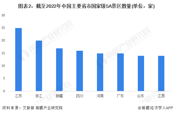 从国家级5A级景区区域分布看,截至2022年底,中国国家级5A景区最多的省份为江苏,有25家,其次是浙江,有20家,新疆有17家位列第三。