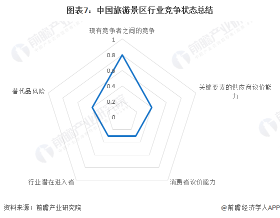 根据以上分析,对各方面的竞争情况进行量化,1代表最大,0代表最小,目前我国旅游景区行业五力竞争总结如下: