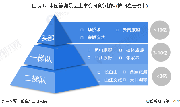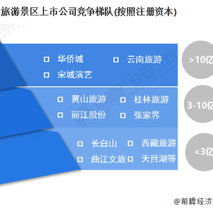 从旅游景区行业竞争梯队看,注册资本超过10亿元的企业主要有华侨城、宋城演艺和云南旅游,3-10亿注册资本的旅游景区上市企业主要有黄山旅游、丽江股份等。