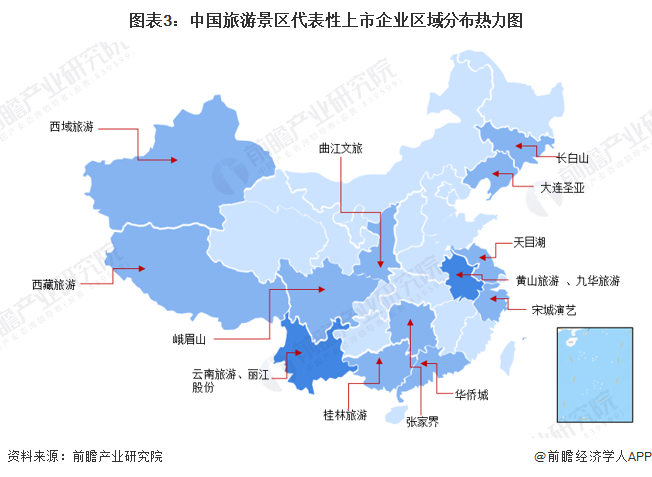 从旅游景区上市公司区域分布看,云南、安徽均有2家上市公司,吉林、辽宁、江苏、浙江、广东、新疆、西藏等省份均有1家。