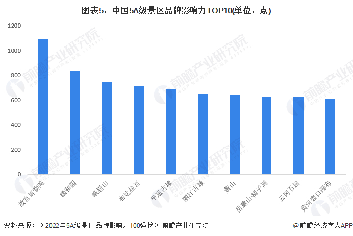 《2022年5A级景区品牌影响力100强榜》数据显示,2022年品牌影响力排名前十的景区分别为故宫博物院、颐和园、峨眉山景区、布达拉宫景区、平遥古城景区、丽江古城景区、黄山风景区、岳麓山·橘子洲旅游区、云冈石窟、黄河壶口瀑布旅游区。
