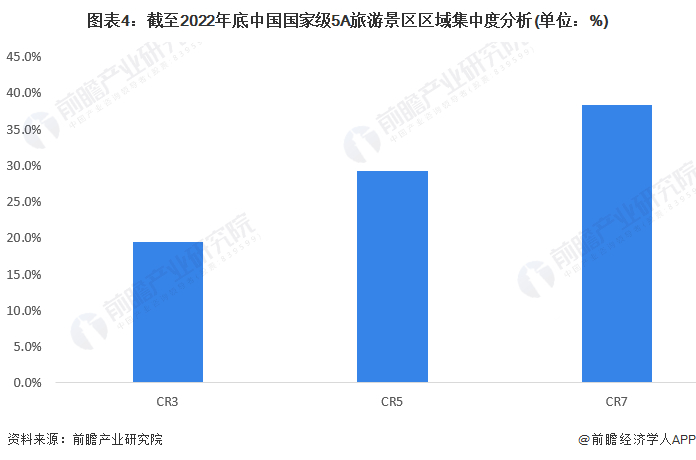 截至2022年底,中国国家级5A景区数量总计318家。从区域集中度看,国家级5A景区最多的前3个省份5A景区合计62家,前5个省份合计93家,前7个省份合计122家,占比分别超过19%、29%和38%。