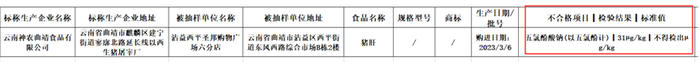 云南省市场监督管理局公布的2023年第35期食品抽检信息显示,标称云南神农曲靖食品有限公司生产的猪肝被检出五氯酚酸钠(以五氯酚计)项目不合格。