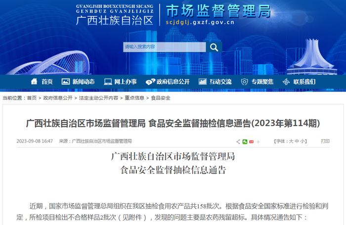 中国质量新闻网讯 2023年9月8日,广西壮族自治区市场监督管理局网站发布食品安全监督抽检信息通告(2023年第114期)。