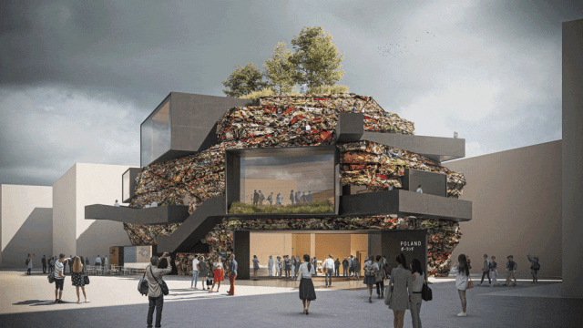 波兰这次策划了一座主要由建筑垃圾制成立面的独特展馆,粗犷的外形旨在传达环保意识,刺激人们不断探寻环境破坏的解决方法,呼应“拯救生命”的会展理念。