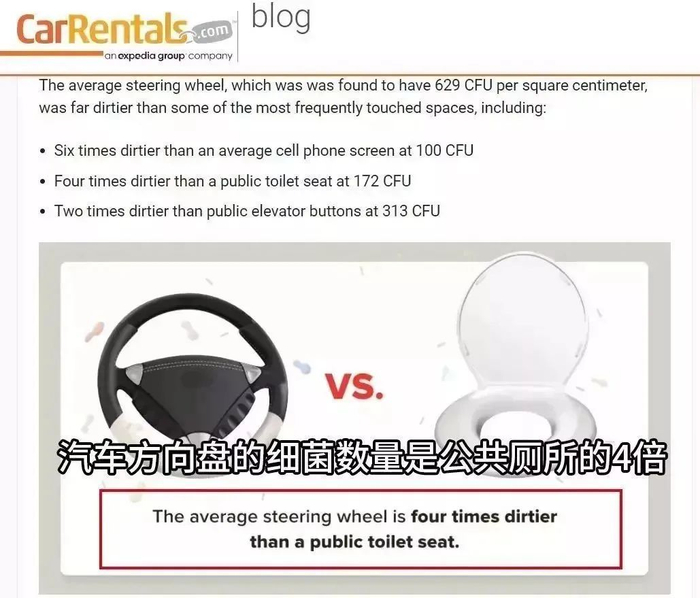 据美国CarRentals网站的一项研究显示:汽车方向盘的细菌数量是公共厕所马桶的4倍!这可不是危言耸听!