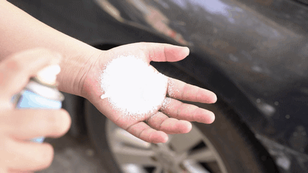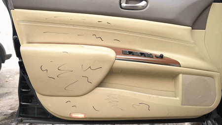 我们再来看看TA对车门板这类塑料较多的部位清洁能力,将泡沫清洁剂摇匀后喷在脏污处,擦几下发现脏污已经被轻松消除!
