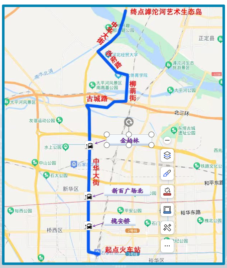 2、途经街道:新石南路、中华大街、古城西路、柳荫街、学府路、中华大街至滹沱河艺术生态岛。